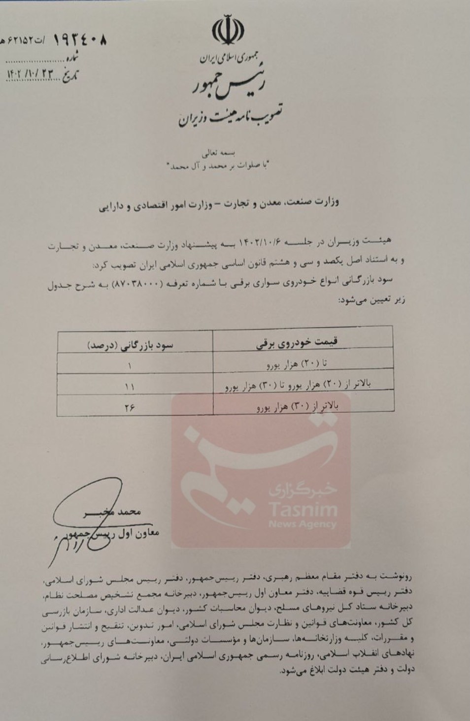 خودروهای برقی تا 20 هزار یورو، سود بازگانی یک درصد، خودروهای برقی بالاتر از 20 هزار تا 30 هزار یورو 11 درصد سود بازرگانی و خودروهای بالاتر از 30 هزار یورو 26 درصد سود بازرگانی اختصاص می یابد.