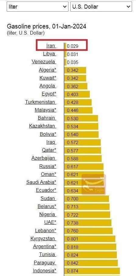 جدیدترین آمارها از قیمت بنزین در دنیا نشان می‌دهد ارزان‌ترین بنزین دنیا در ایران عرضه می‌شود و قیمت دلاری هر لیتر بنزین در کشورهای همسایه ایران تا 40برابر قیمت این محصول در ایران است.