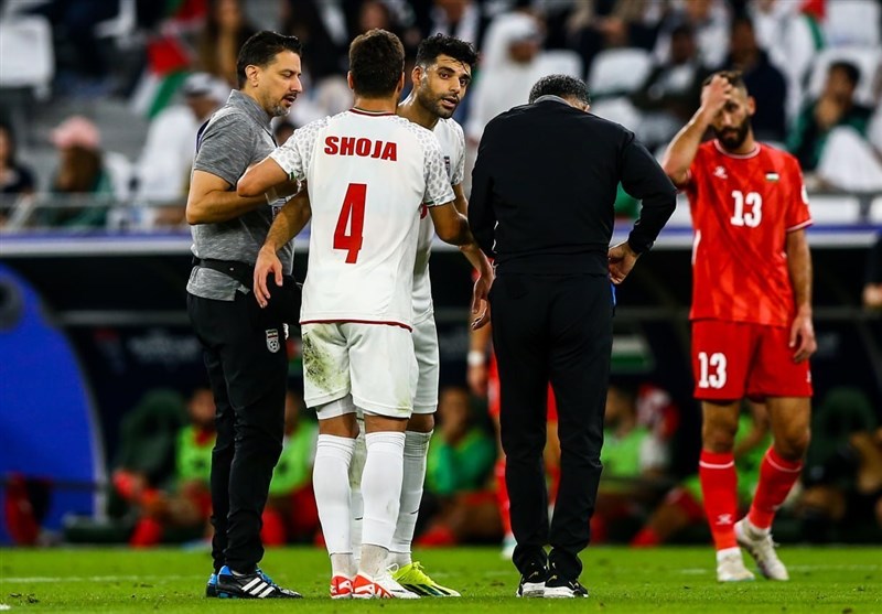 * شجاع خلیلزاده که در دیدار با فلسطین از ناحیه کف پا دچار مصدومیت شده بود، با کفش شخصی فقط به قدم زدن کنار زمین پرداخت.