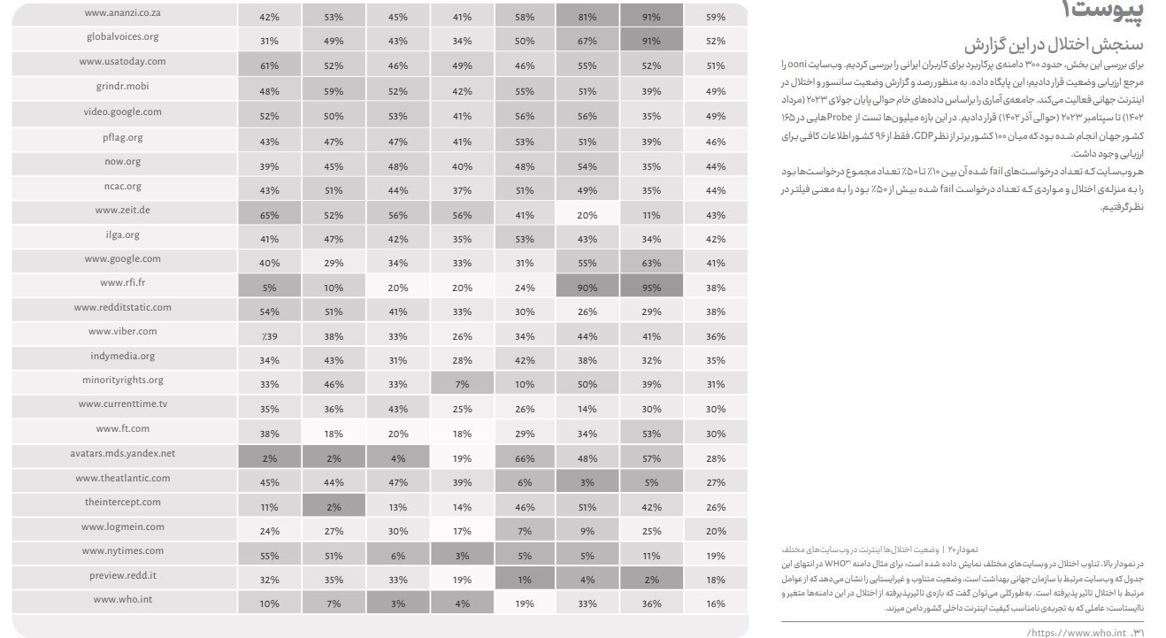 برای بررسی این بخش، حدود 300 دامنهی پرکاربرد برای کاربران ایرانی را بررسی کردیم. وب سایت ooni را مرجع ارزیابی وضعیت قرار دادیم؛ این پایگاه داده، به منظور رصد و گزارش وضعیت سانسور و اختالل در اینترنت جهانی فعالیت می کند. جامعهی آماری را براساس داده های خام حوالی پایان جولای 2023 (مرداد 1402) قرار دادیم. در این بازه میلیون ها تست از Probeهایـی در 165 کشور جهان انجام شده بود که میان 100 کشـور برتـر از نظـر GDP، فقط از 96 کشـور اطلاعات کافـی بـرای ارزیابی وجود داشت.