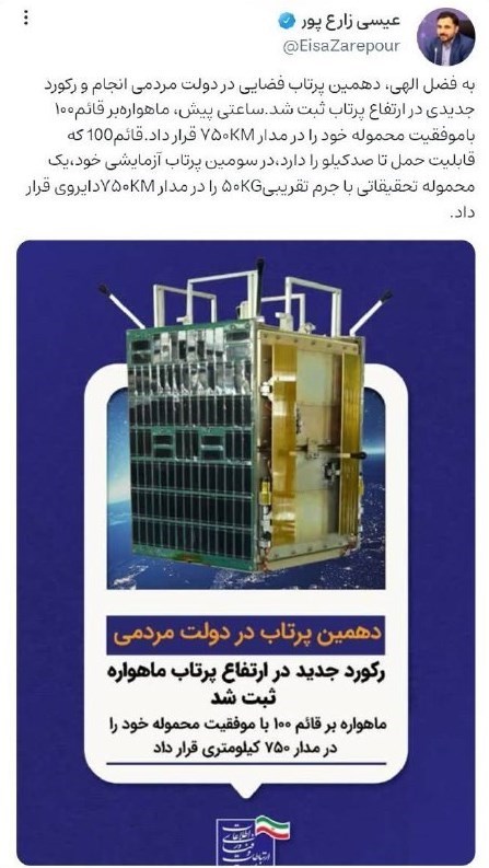 به گزارش خبرنگار اقتصادی خبرگزاری تسنیم، عیسی زارع پور در مورد پرتاب ماهواره ثریا به فضا نوشت: لحظاتی پیش ماهواره‌بر قائم100 باموفقیت محموله خود را در مدار 750 کیلومتری قرار داد.