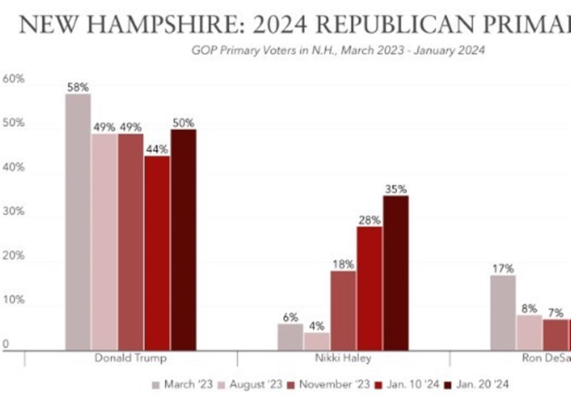 براساس نتایج این نظرسنجی، نیمی از رای دهندگان یعنی 50 درصد، قصد دارند در انتخابات مقدماتی ایالت نیوهمپشایر به ترامپ رای دهند در حالی که این رقم برای نیکی هیلی 35 درصد است.
