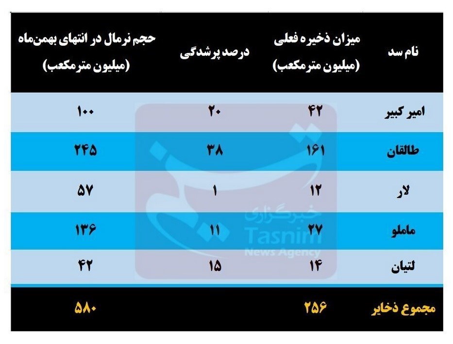 میزان ذخایر سدهای تهران نیز شرایط مطلوبی ندارد بهطوری که مجموع ذخایر سدهای پنچگانه تهران به 256 میلیون مترمکعب میرسد. ظرفیت اسمی سدهای تأمین آب تهران بالغ بر یک میلیارد و 930 میلیون مترمکعب است.