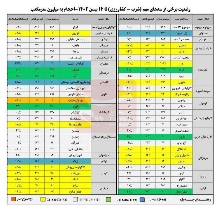 همانطور که در جدول بالا مشخص است، ذخایر آبی سدهای دوستی، طرق، دز، پانزده خرداد، جره، مارون، استقلال، شمیل و نیان، سرنی، نهرین، دامغان، رئیسعلی دلواری، سلمان فارسی، رودبال داراب، چاهنیمهها، تنگوئیه سیرجان، جیرفت، نساء، ساوه، کمال صالح و شهید رجائی، نسبت به مدت مشابه سال قبل، کاهشی بین 25 تا 90 درصد داشته است.