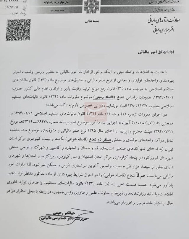واحدهای تولیدی مستقر در 120 کیلومتری استان تهران  به استثنای شهرکهای صنعتی قم، اشتهارد، کاسپین و شهرکهای محدوده فیروزکوه از معافیت و مشوقهای ماده 132 قانون مالیاتهای مستقیم بهره مند نخواهند شد. این مقرره شامل واحدهای تولیدی 50 کیلومتری اصفهان و 30 کیلومتری سایر مراکز استانها نیز نخواهد شد.