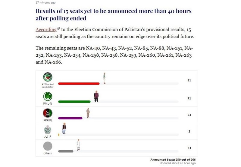 به گزارش دفتر منطقهای خبرگزاری تسنیم، تازهترین گزارش منتشر شده توسط کمیسیون انتخابات پاکستان حاکی از اعلام نتیجه 250 کرسی از مجموع 266 کرسی پارلمان پاکستان است که سرنوشت آن از طریق انتخابات مستقیم گرفته میشود.