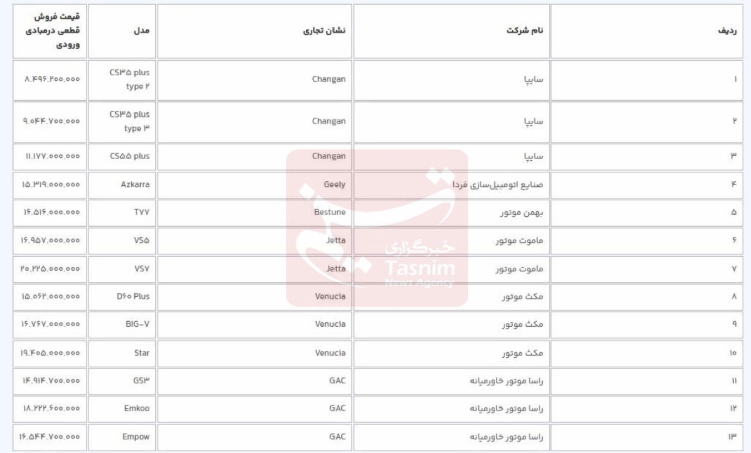جدول شماره 1: قیمت فروش محاسباتی قطعی خودروهای وارداتی در مبادی ورودی واحد: ریال
