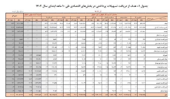 جدول 1 بیانگر هدف از دریافت تسهیلات پرداختی در بخشهای اقتصادی طی 10 ماهه ابتدای سال 1402 میباشد. سهم تسهیلات پرداختی در قالب سرمایه در گردش در کلیه بخشهای اقتصادی طی 10 ماهه سال 1402 مبلغ 26،527.9 هزار میلیارد ریال معادل 75.6 درصد کل تسهیلات پرداختی به صاحبان کسب و کار است. همچنین سهم تسهیلات پرداختی در قالب خرید کالای شخصی توسط مصرف کننده نهایی (خانوار) مبلغ 3،215.0 هزار میلیارد ریال معادل 40.2 درصد از کل تسهیلات پرداختی به مصرف کنندگان نهایی (خانوار) میباشد.
