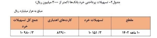 از کل تسهیلات پرداختی در دوره یاد شده، مبلغ 3/10،151 هزار میلیارد ریال معادل 6/23 درصد به صورت تسهیلات خرد اعطا شده است. همچنین مبلغ 0/829 هزار میلیارد ریال نیز در قالب کارتهای اعتباری انجام پذیرفته است، که با احتساب این مبلغ، کل تسهیلات پرداختی خرد (کمتر از سه میلیارد ریال) به مبلغ 3/10،980 هزار میلیارد ریال معادل 0/25 درصد کل تسهیلات پرداختی را شامل میشود.
