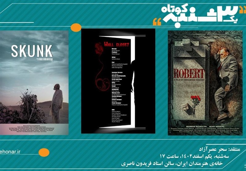 به گزارش خبرگزاری تسنیم، سه فیلم کوتاه «کمدی دیواری» ساخته مهدی بازیار، «رابرت» به کارگردانی محمد حقانی و «تدلیس» ساخته ونوس خدادوستان، عصر سهشنبه یکم اسفند 1402 ساعت 17 در سالن استاد فریدون ناصری خانه هنرمندان ایران نمایش داده میشود.