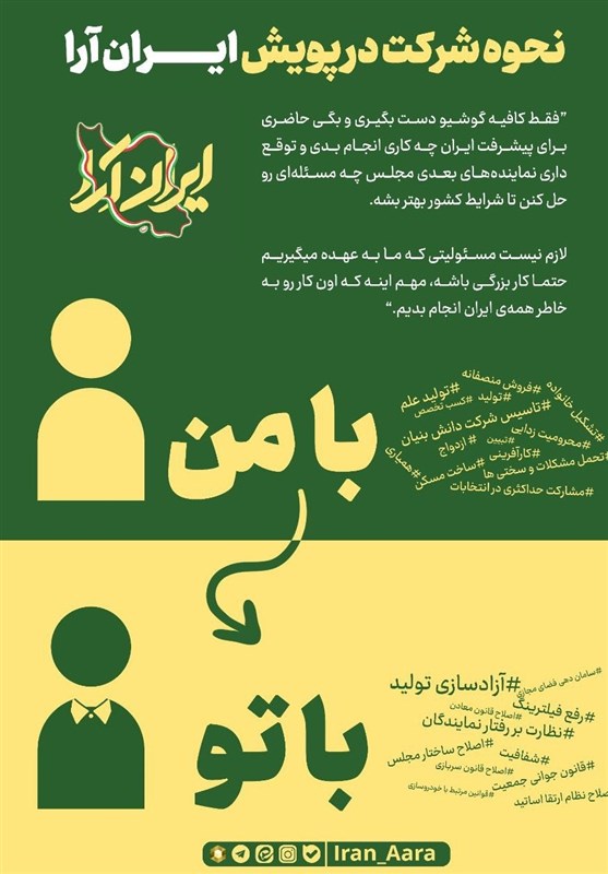 علاقه مندان برای شرکت در این پویش با تهیه فیلم چند ثانیه ای ضمن معرفی خود اعلام می کنند برای پیشرفت ایران چه کاری انجام خواهند داد و از نمایندههای آینده مجلس شورای اسلامی انتظار دارند چه مسائلی را حل کنند تا شرایط کشور بهتر شود.