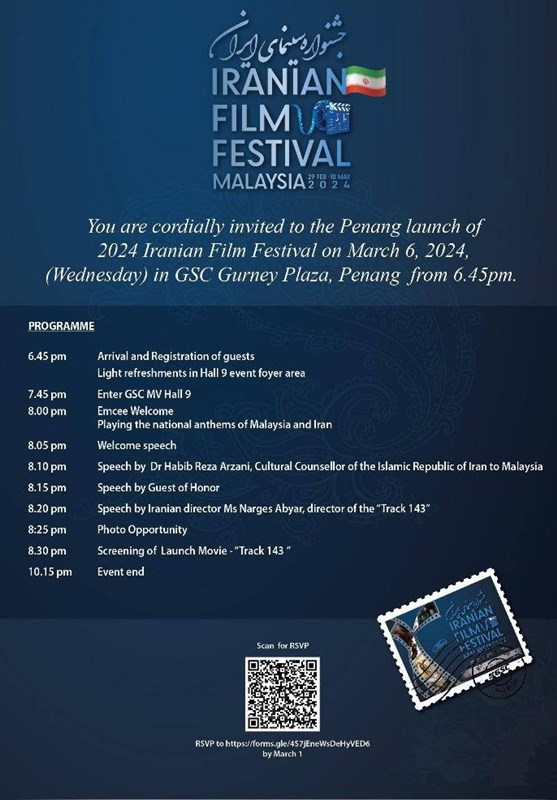 گفتنی است جشنواره فیلمهای ایرانی 2024 از 29 فوریه تا 10 مارس در کشور مالزی از سوی رایزنی فرهنگی جمهوری اسلامی ایران در مالزی و با حمایت سازمان فرهنگ و ارتباطات اسلامی و پشتیبانی سفارت جمهوری اسلامی ایران در این کشور برگزار میشود.