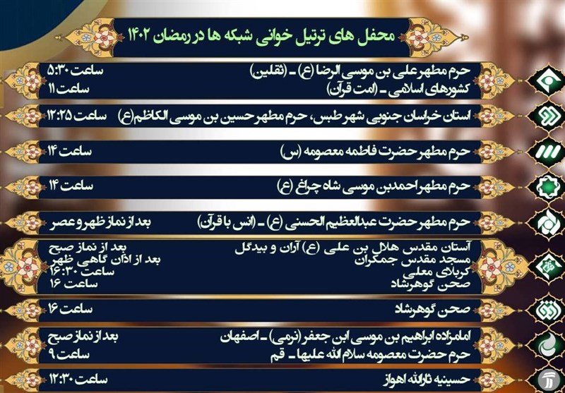 حرم مطهر احمدبن موسی شاه چراغ (ع) هر روز ساعت 14 میزبان ترتیلخوانان روزهدار است که از شبکه چهار به صورت زنده و مستقیم به روی آنتن میرود.