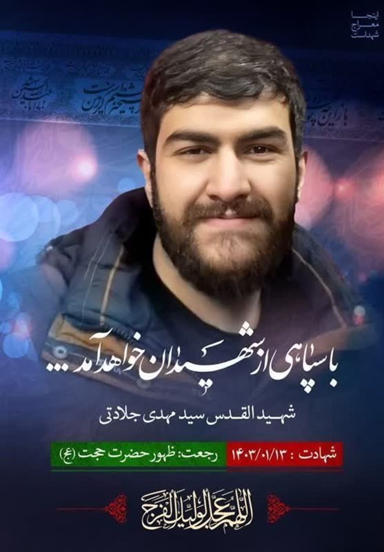 به گزارش خبرنگار فرهنگی خبرگزاری تسنیم، شهید «سیدمهدی جلادتی» به سال  1378 مصادف با شب ولادت حضرت صاحب‌الزمان (عج) متولد شد. مهدی از بسیجیان و فعالان مسجد میثم بود که سال 1400 وارد سپاه پاسداران انقلاب اسلامی شد و پس از عملیات طوفان‌الاقصی و نقش نیروی قدس سپاه در پشتیبانی جبهه مقاومت، اول بهمن سال 1402 به سوریه اعزام شد.
