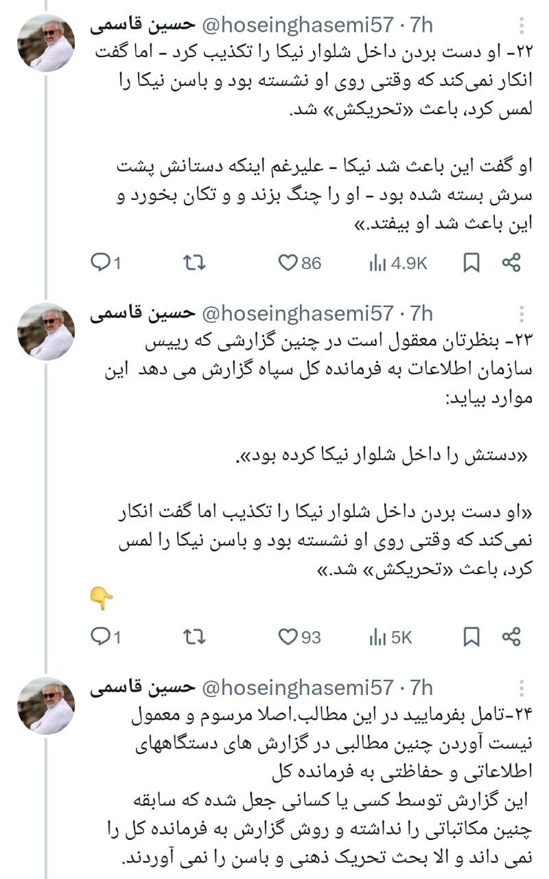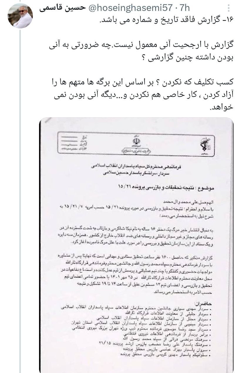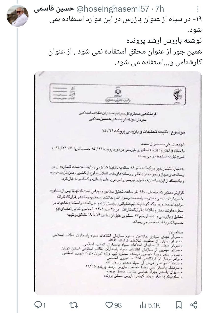 فارغ از این که خانم نیکا شاهکرمی بر اثر چه حادثه یا اتفاقی فوت کرده، میتوان با قاطعیت گفت گزارشی که توسط بیبیسی منتشر شده ، به دلایل مختلف جعلی و فاقد اعتبار است. جعل کننده از اطلاعات بسیار کمی درباره سازمان و سازکار سپاه برخوردار بوده یا تعمد داشته است.
