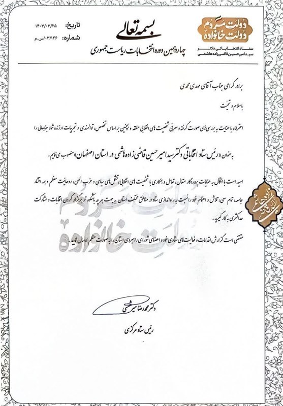 به گزارش خبرگزاری تسنیم از اصفهان، محمدرضا میرشمسی، رئیس ستاد انتخاباتی سیدامیرحسین قاضی‌زاده هاشمی در حکمی مهدی محمدی را به‌عنوان رئیس ستاد انتخاباتی قاضی‌زاده هاشمی در استان اصفهان در چهاردهمین انتخابات ریاست جمهوری منصوب کرد.