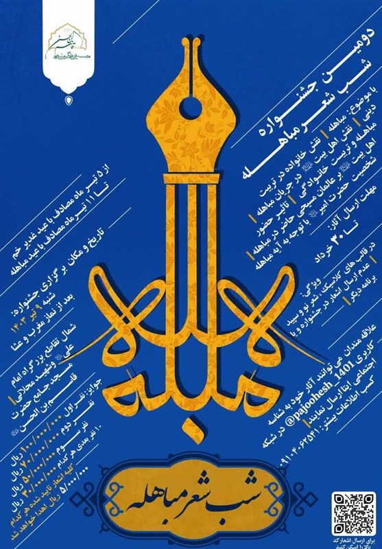 به گزارش خبرگزاری تسنیم، دومین جشنواره شب شعر «مباهله» از 5 تیر ماه مصادف با عید غدیر خم تا 11 تیرماه مصادف با عید مباهله برگزار می‌شود. این دوره جشنواره با این موضوعات برپا خواهد شد: مباهله؛ نقش خانواده در تربیت دینی؛ نقش اهل بیت علیهم السلام در جریان مباهله؛مباهـله و تربیـت خانـوادگی؛ تأثیـر حضور اهل بیت علیهم السلام بر عالمان مسیحی حاضر در مباهله؛ شخصیت حضرت امیر علیه السلام با توجه به آیه مباهله.