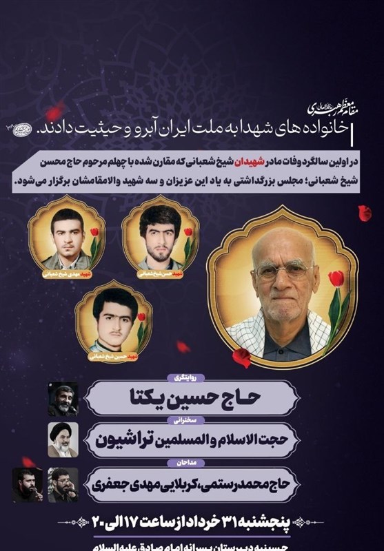 به گزارش خبرگزاری تسنیم، تقارن اربعین پدر جهادگر و سالگرد مادر سه شهید حسن، حسین و مهدی شیخ شعبانی در ایام اعیاد قربان و غدیر، یادآور تربیت مادران و پدرانی است که با ایمان، اخلاص و بصیرت انقلابی، عزیزان خود را به قربانگاه عشق روانه کردند تا ولایت بماند و ولایتمداری به عنوان تنها راه عاقبت بخیری، میراث آیندگان شود.