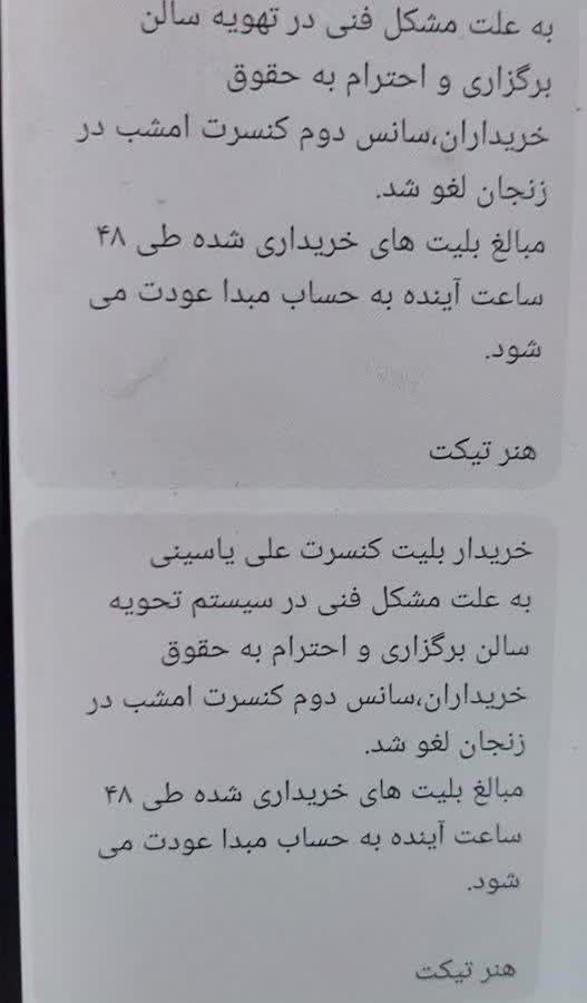 پیامکی به خریداران بلیت از سوی هنرتیکت با این مضمون ارسال شده است: خریدار بلیت کنسرت علی یاسینی بهعلت مشکل فنی در سیستم تهویه سالن برگزاری و احترام به حقوق خریداران سانس دوم کنسرت امشب در زنجان لغو شد.