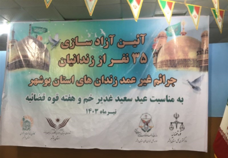 به گزارش خبرگزاری تسنیم از بوشهر، همزمان با عید سعید غدیر خم و گرامیداشت هفته قوه قضاییه صبح امروز با حضور رئیس کل دادگستری، مدیرکل زندانها و اقدمات تامینی و تربیتی، قضات، معاون دادگستری استان بوشهر 35 زندانی جرایم غیرعمد مالی از زندانهای استان بوشهر آزاد شدند.