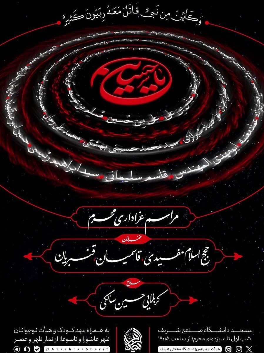 این مراسم با سخنرانی حجج الاسلام مفیدی، قاسمیان و قنبریان و مدیحه سرایی حسین سالکی به همراه هیئت کودک و نوجوانان از شب اول محرم به مدت 13 شب از 16 تا 28 تیرماه از ساعت 19/15 شب و ظهر تاسوعا و عاشورا از نماز ظهر و عصر به بعد در مسجد دانشگاه صنعتی شریف برگزار می شود.