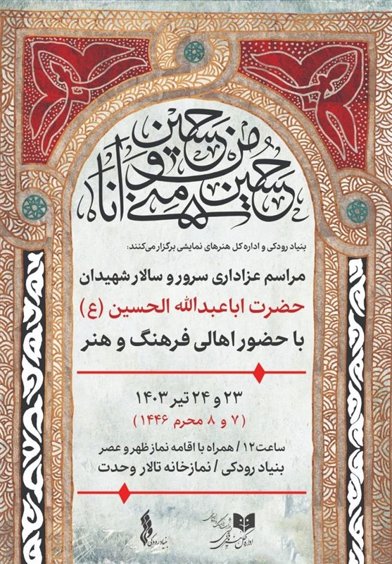 مراسم عزاداری اهالی فرهنگ و هنر در روزهای شنبه بیست و سوم و یکشنبه بیست و چهارم تیر ماه، مصادف با هفت و هشت محرم از ساعت 12 ظهر در نمازخانه تالار وحدت برگزار میشود.