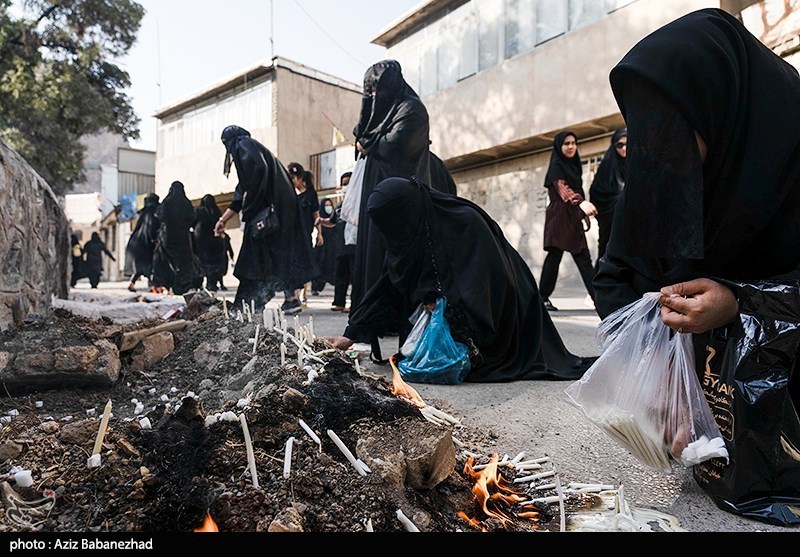 دختران رخ در نقاب، شمعها را در منبرها جا میگذارند و بعد مشتی برنج و چند تکه قند را از منبر عزا و بهرسم برکت با خود میبرند تا همۀ اتفاقهای شور را در دخیل «عباس» شیرین کنند.