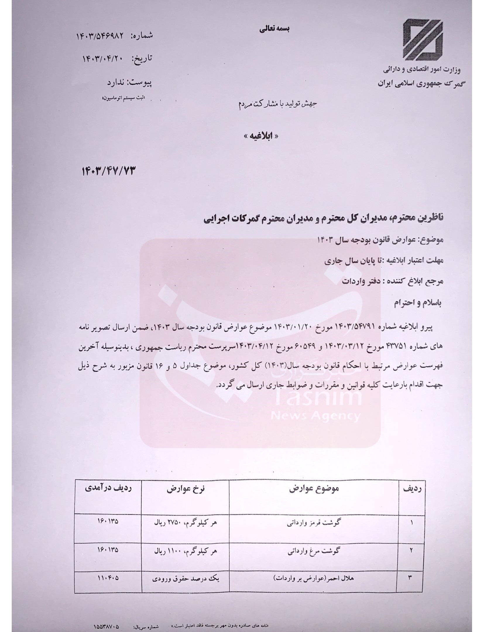 عوارض واردات هر کیلوگرم مرغ برای اجرا تا پایان سال 110 تومان و هر کیلوگرم گوشت قرمز 270 تومان تعیین و ابلاغ شد.