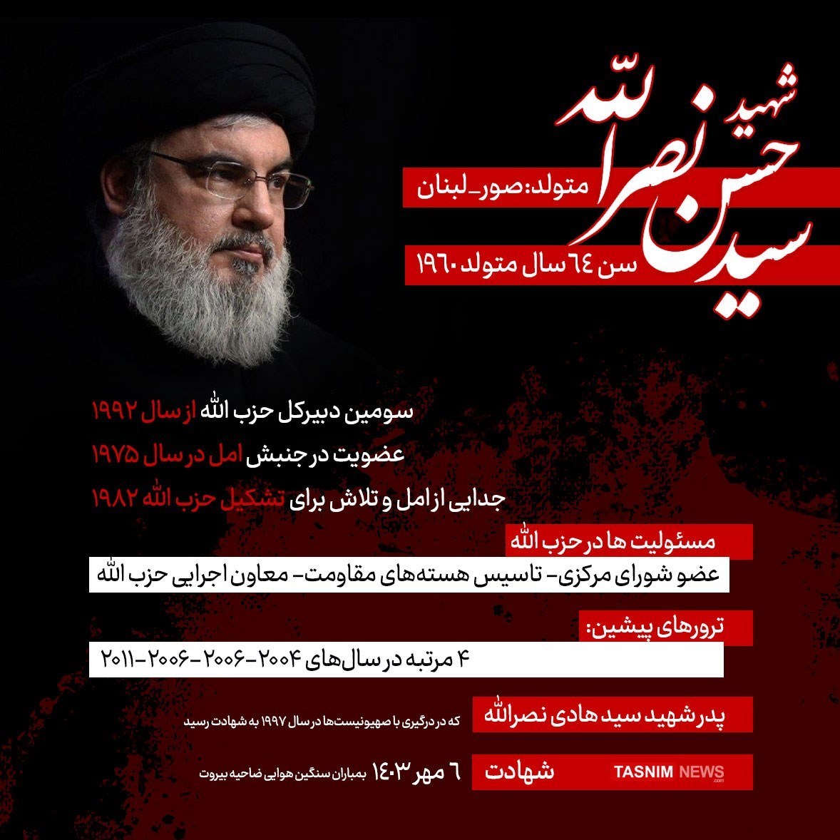 شهید سید حسن نصرالله دببرکل حزب الله لبنان در حمله روز 6 مهر اسرائیل به ضاحیه بیروت به همراه گروهی دیگر از فرماندهان حزب الله به شهادت رسید.