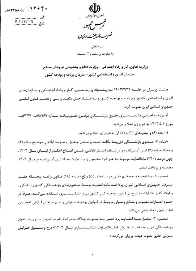تبصره 2- مبلغ مابهالتفاوت پرداختی به صورت جداگانه در احکام صادره از سوی صندوق بازنشستگی ذیربط، تحت عنوان «ما بهالتفاوت متناسبسازی سال 1403» مندرج و مشمول افزایش سنواتی حقوق مصوب هیئت وزیران میگردد.»