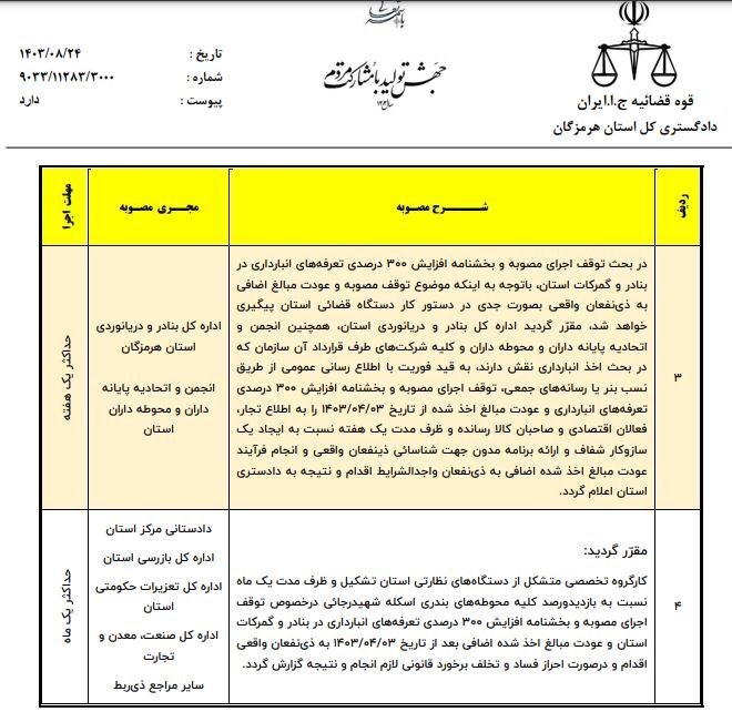به واسطه صدور مصوبه تلیق افزایش 300 درصد تعربفه انبار داری مقرر گردیده، کارگروه تخصصی متشکل از دستگاه های نظارتی استان تشکیل و ظرف مدت یک ماه نسبت به بازدید و رصد کلیه محوطه های بندری اسکله شهید رجایی در خصوص توقف اجرای مصوبه و بخشنامه افزایش 300 درصدی تعرفه های انبار داری در بنادر و گمرکات استان و عودت مبالغ اخذ شده اضافی بعد از تاریخ 1403/04/03 به ذی نفعان واقعی اقدام و در صورت احراز فساد و تخلف برخورد متناسب صورت گیرد.