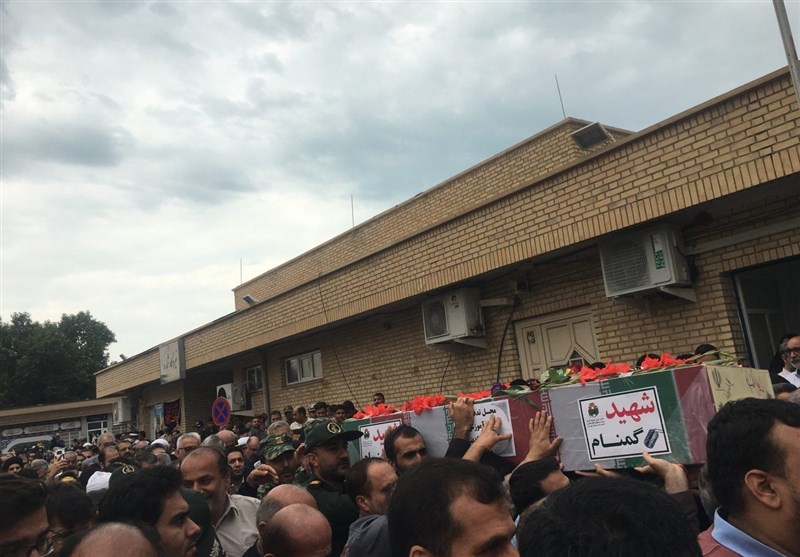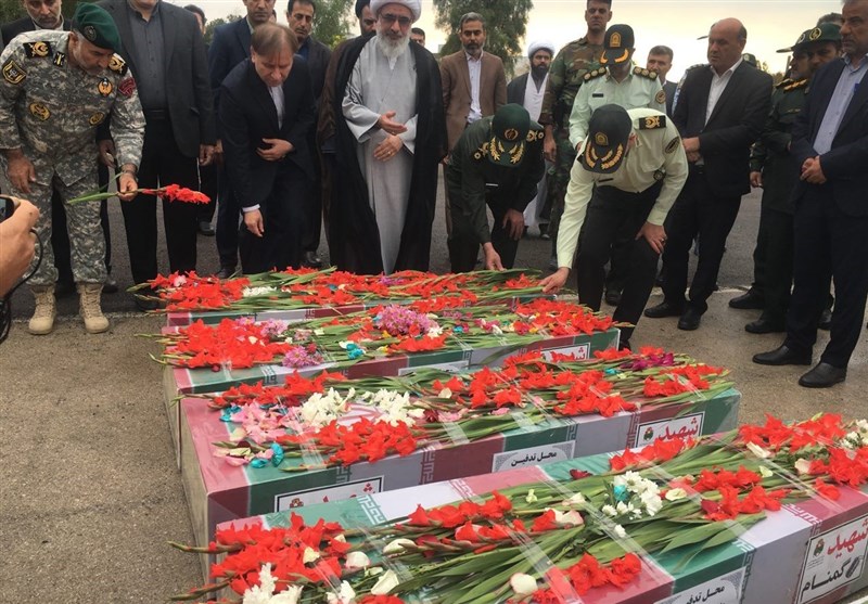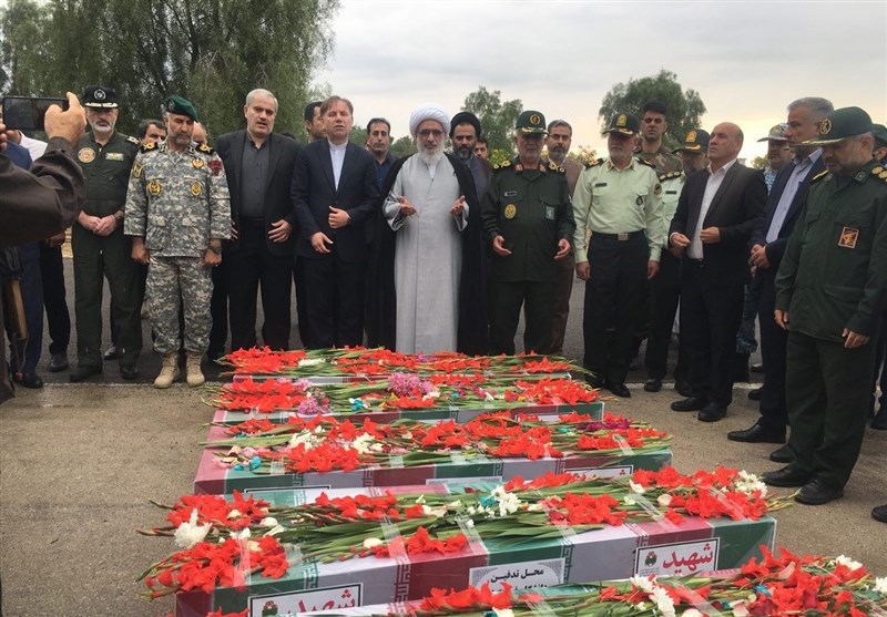 در این آیین که نماینده ولی فقیه در استان، امام جمعه، استاندار، فرماندهان نیروهای مسلح، خانواده معظم شهدا، دانشآموزان، دانشجویان و کارکنان ادارات حضور داشتند با شعار این گل پر پر از کجا آمده از سفر کربوبلا آمده، مرگ بر آمریکا، مرگ بر اسرائیل پیکر این 5 شهید 8 سال دفاع مقدس را تشییع کردند.