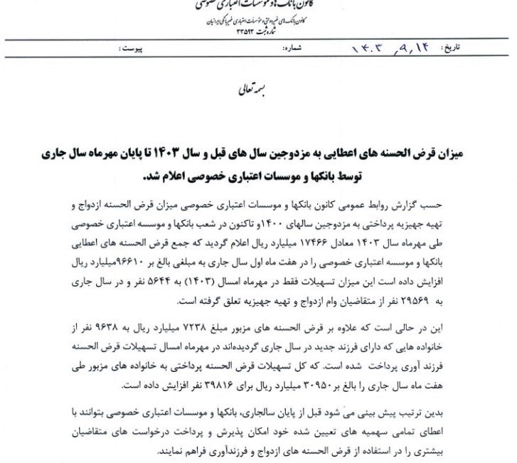این در حالی است که علاوه بر قرض الحسنه مذبور مبلغ 7238 ملیارد ریال به 9638 نفر از خانواده هایی که دارای فرزند جدید در سال جاری شده اند، در مهر ماه سال جاری وام قرض الحسنه فرزند آوری پرداخت شده است که کل تسهیلات قرض الحسنه پرداختی به خانواده های مزبور در هفت ماهه سال جاری بالغ بر 30 هزار و 950 میلیارد ریال برای 39 هزار و 816 نفر افزایش داده است.