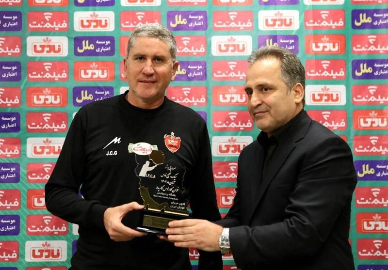 اهدای جایزه به خوان کارلوس گاریدو پیش از آغاز نشست خبری دیدار پرسپولیس - نساجی در هتل المپیک تهران صورت گرفت.