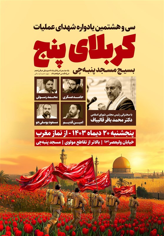 به گزارش خبرنگار فرهنگی خبرگزاری تسنیم، سیوهشتمین یادواره شهدای عملیات کربلای پنج از نماز مغرب و عشاء در مسجد پنبهچی واقع در خیابان ولیعصر(عج) بالاتر از چهارراه امیریه برگزار میشود.