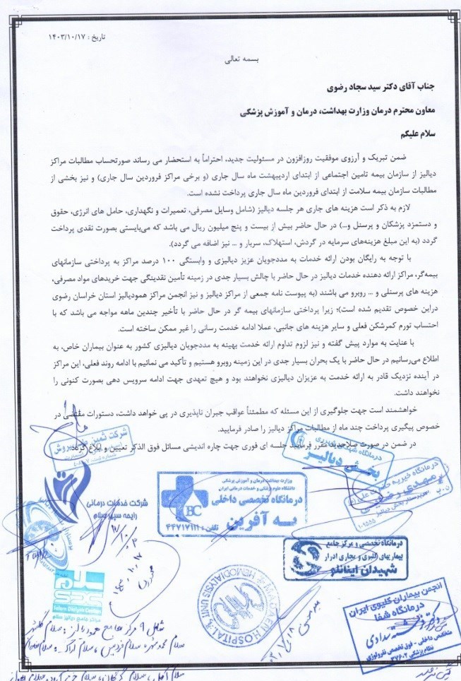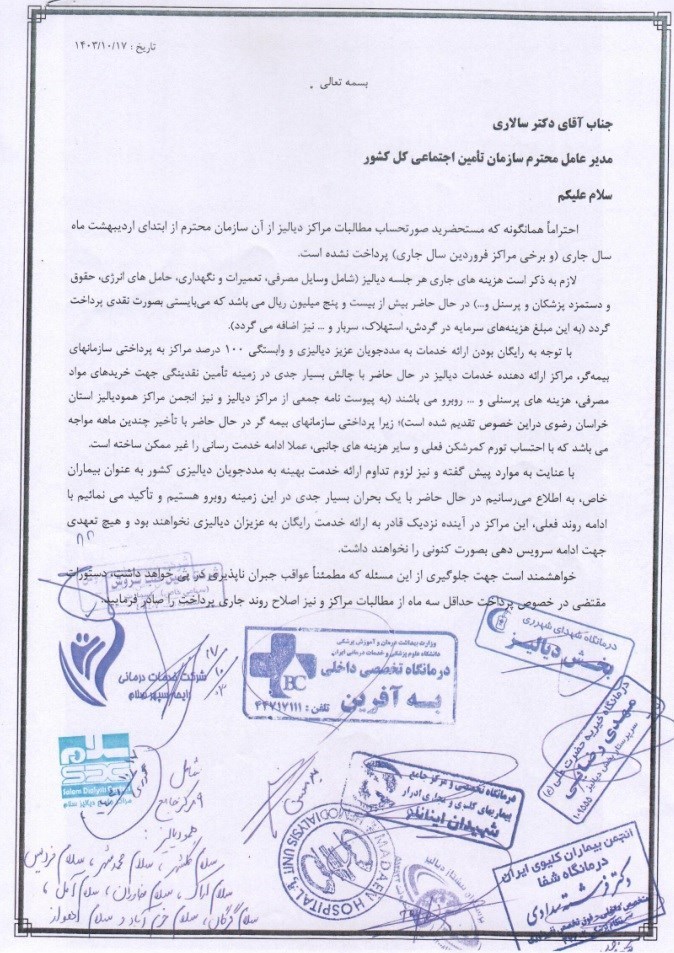 در ادامه نامههای انجمنها و مراکز دیالیز کشورمان خطاب به وزارت بهداشت و سازمان تامین اجتماعی آمده است: