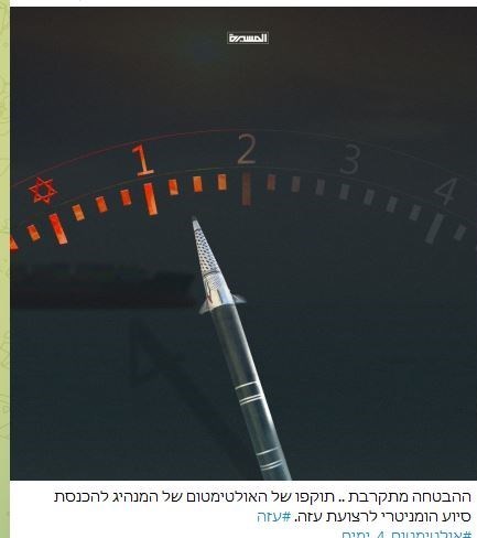 در تصویری که به زبانهای عربی و عبری طراحی شده است، تا پایان اولتیماتوم چهار روزه رهبر انقلاب یمن برای ازسرگیری عملیات نیروهای مسلح یمن، یک روز مانده است و اگر صهیونیستها تا یک روز دیگر به اقدامات جنایتکارانه خود و محاصره مردم غزه پایان ندهند، عملیات نیروهای مسلح یمن علیه این رژیم ازسرگرفته خواهد شد.