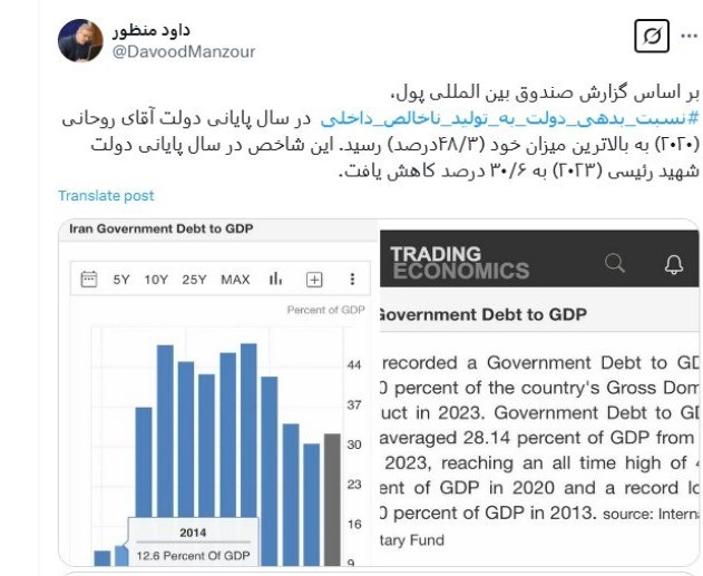 به گزارش خبرگزاری تسنیم، داود منظور رئیس سابق سازمان برنامه و بودجه در فضای مجازی نوشت: بر اساس گزارش صندوق بین المللی پول نسبت بدهی دولت به تولید ناخالص داخلی در سال پایانی دولت آقای روحانی (2020) به بالاترین میزان خود (48/3درصد) رسید. این شاخص در سال پایانی دولت شهید رئیسی (2023) به 30/6 درصد کاهش یافت.
