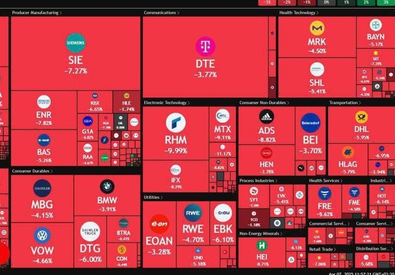 همانطور که در تصویر زیر مشخص است، واکنش بورسهای دنیا به سیاستهای تعرفهای ایالات متحده عمدتاً منفی بوده است و ریزشهایی قابل توجه تا این لحظه ثبت شده است.