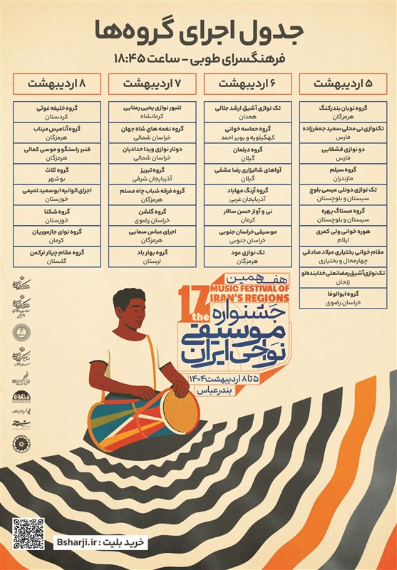 علاقهمندان میتوانند برای تهیه بلیت اجراهای جشنواره موسیقی نواحی، از یکم اردیبهشت 1404 به سایت http://bsharji.ir/ مراجعه کنند.