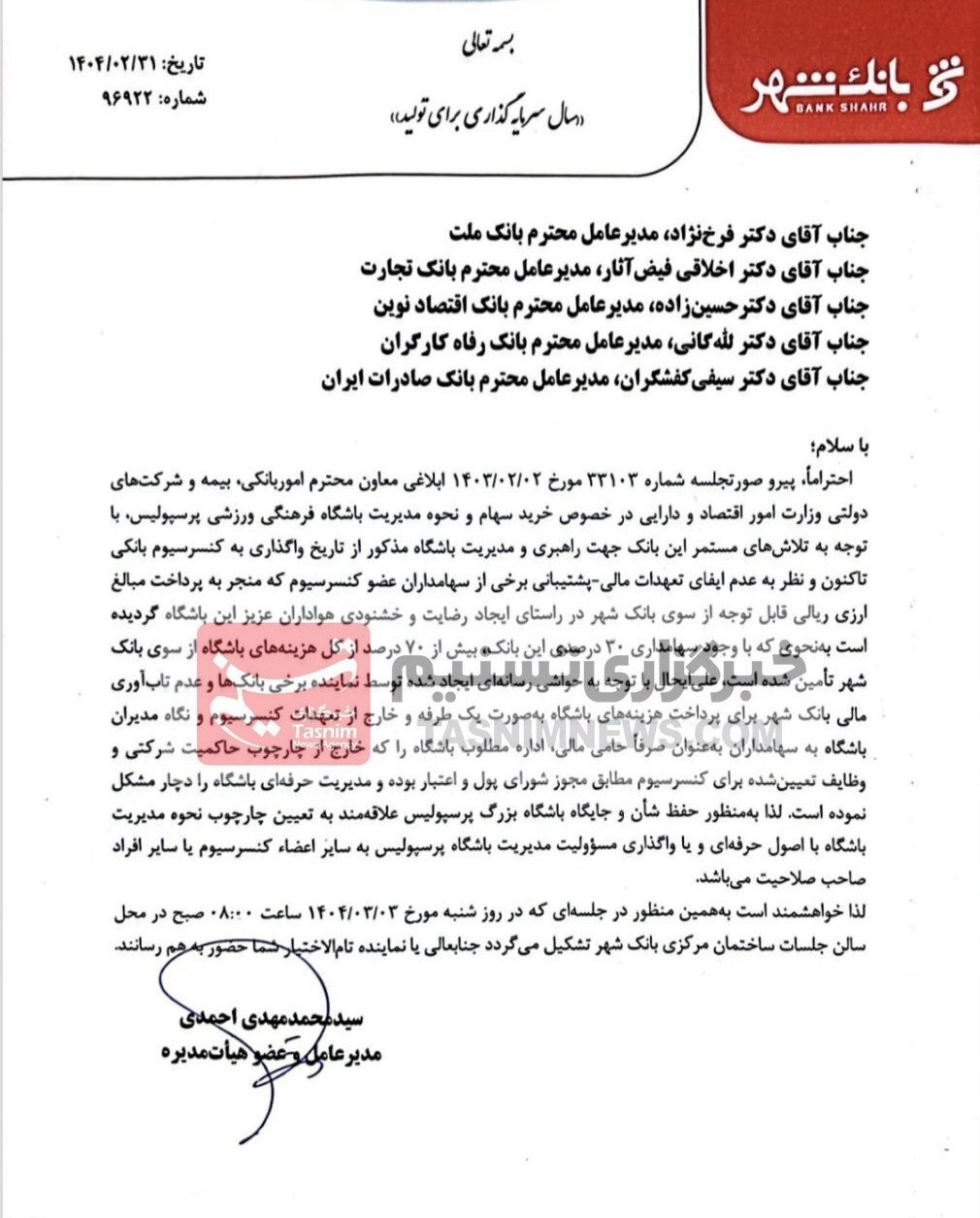 به گزارش خبرنگار ورزشی خبرگزاری تسنیم، بانک شهر به طور رسمی با ارسال نامهای به بانکهای ملت، تجارت، اقتصادنوین، رفاه کارگران و صادرات، انصراف خود از مدیریت کنسرسیوم بانکی مالکان پرسپولیس را اعلام کرد .