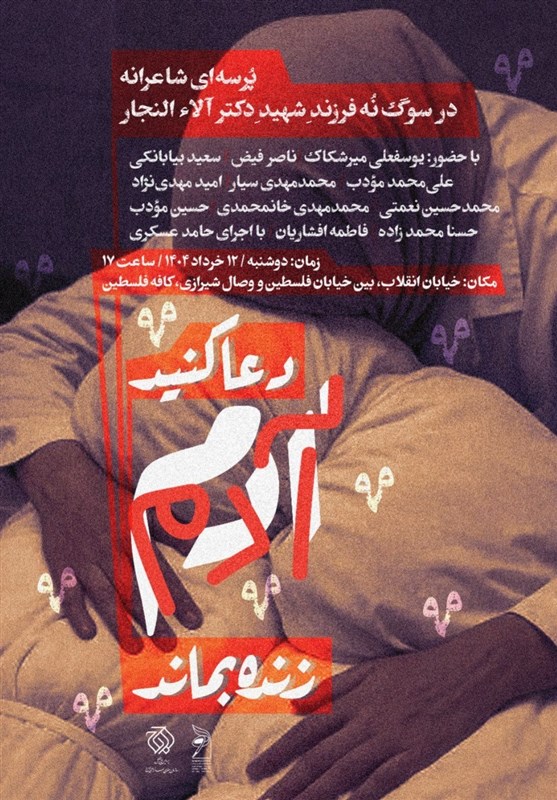 آیین «دعا کنید آدم زنده بماند» فردا دوشنبه 12 خرداد 1404، ساعت 17 در محل کافه فلسطین واقع در خیابان انقلاب، بین خیابان فلسطین و وصال شیرازی برگزار میشود.