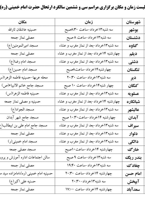 امام جمعه موقت بوشهر از برگزاری مراسم سی و ششمین سالگرد ارتحال حضرت امام خمینی (ره) در شهرستانهای 10 گانه استان بوشهر خبر داد و تصریح کرد: به همین مناسب در همه شهرها و روستاهای استان برنامه مراسم سالگرد ارتحال امام خمینی (ره) با حضور اقشار مختلف مردم برگزار میشود.