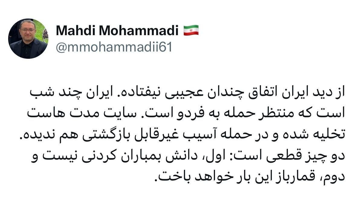 به گزارش گروه سیاسی خبرگزاری تسنیم، مهدی محمدی مشاور راهبردی رئیس مجلس شورای اسلامی با انتشار پستی در شبکه اجتماعی ایکس در واکنش به حمله آمریکا به تأسیسات هستهای ایران نوشت: «از دید ایران اتفاق چندان عجیبی نیفتاده است، ایران چند شب است که منتظر حمله به فردو است، سایت مدتهاست تخلیه شده و در حمله آسیب غیر قابل بازگشتی هم ندیده است، دو چیز قطعی است؛ اول دانش بمبارانکردنی نیست و دوم قمارباز این بار خواهد باخت.»