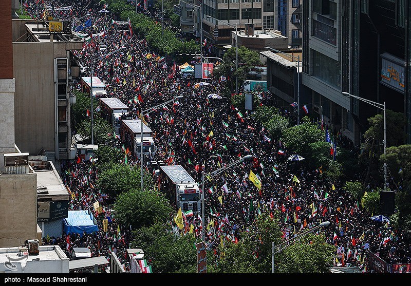 العهد افزود: این مراسم از مقابل دانشگاه تهران آغاز شد و با حضور گسترده مردمی و رسمی به سمت میدان آزادی ادامه یافت. شعارهای «مرگ بر آمریکا»، «مرگ بر اسرائیل» و «لبیک یا خامنهای» در سراسر میدان آزادی طنین انداز بود و شرکت کنندگان در این مراسم تعهد خود را به رهبری جمهوری اسلامی در مقابله با تجاوزات دشمنان جنایتکار ابراز کردند.