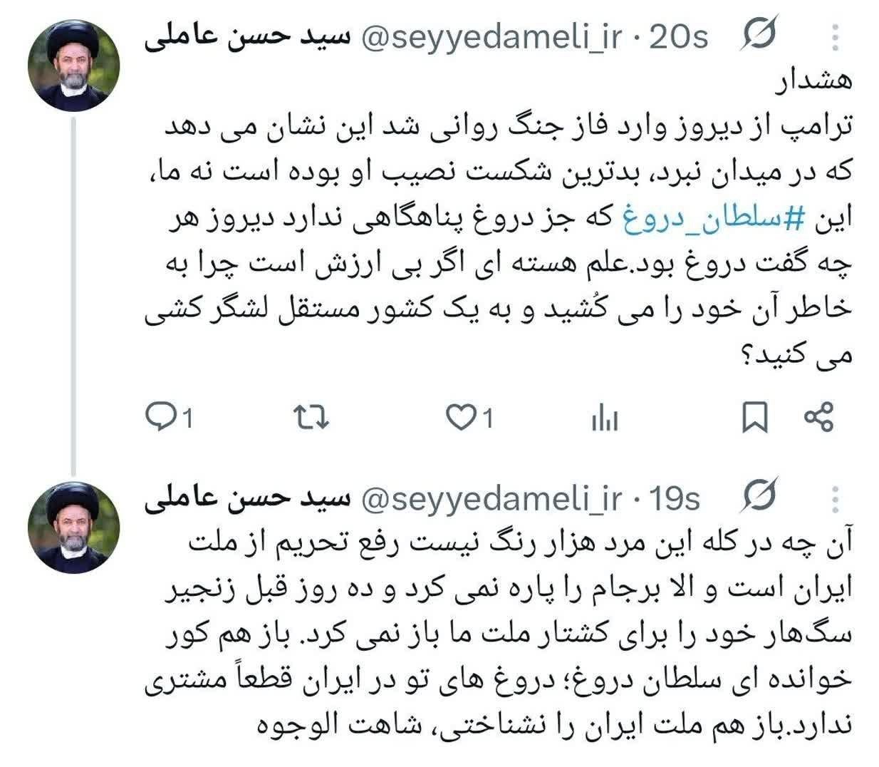 عاملی ابتدا در صفحه شخصی خود در فضای مجازی نوشت: "ترامپ از دیروز وارد فاز جنگ روانی شد این نشان میدهد که در میدان نبرد، بدترین شکست نصیب او بوده است نه ما، این سلطان دروغ که جز دروغ پناهگاهی ندارد دیروز هر چه گفت دروغ بود، علم هستهای اگر بی ارزش است چرا به خاطر آن خود را می کُشید و به یک کشور مستقل لشگر کشی می کنید؟ آن چه در کله این مرد هزار رنگ نیست رفع تحریم از ملت ایران است و الا برجام را پاره نمیکرد و ده روز قبل زنجیر سگهار خود را برای کشتار ملت ما باز نمی کرد. باز هم کور خواندهای سلطان دروغ؛ دروغهای تو در ایران قطعاً مشتری ندارد باز هم ملت ایران را نشناختی، شاهت الوجوه."