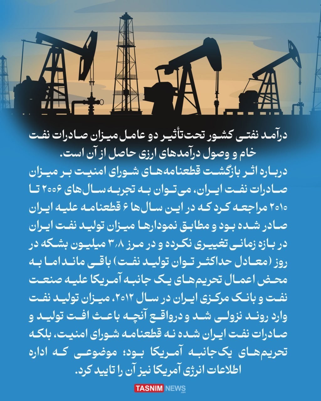 درآمد نفتی کشور تحت‌تأثیر دو عامل میزان صادرات نفت خام و  وصول درآمدهای ارزی حاصل از آن است. درباره اثر بازگشت قطعنامه‌های شورای امنیت بر میزان صادرات نفت ایران، می‌توان به تجربه سال‌های 2006 تا 2010 مراجعه کرد که در این سال‌ها 6 قطعنامه علیه ایران صادر شده بود و مطابق نمودارها  میزان تولید نفت ایران در بازه زمانی تغییری نکرده و در مرز 3.8 میلیون بشکه در روز (معادل حداکثر توان تولید نفت) باقی ماند اما به محض اعمال تحریم‌های یک جانبه آمریکا علیه صنعت نفت و بانک مرکزی ایران در سال 2012، میزان تولید نفت وارد روند نزولی شد و درواقع آنچه باعث افت تولید و صادرات نفت ایران شده نه قطعنامه شورای امنیت، بلکه تحریم‌های یک‌جانبه آمریکا بود؛ موضوعی که اداره اطلاعات انرژی آمریکا نیز آن را تایید کرد.