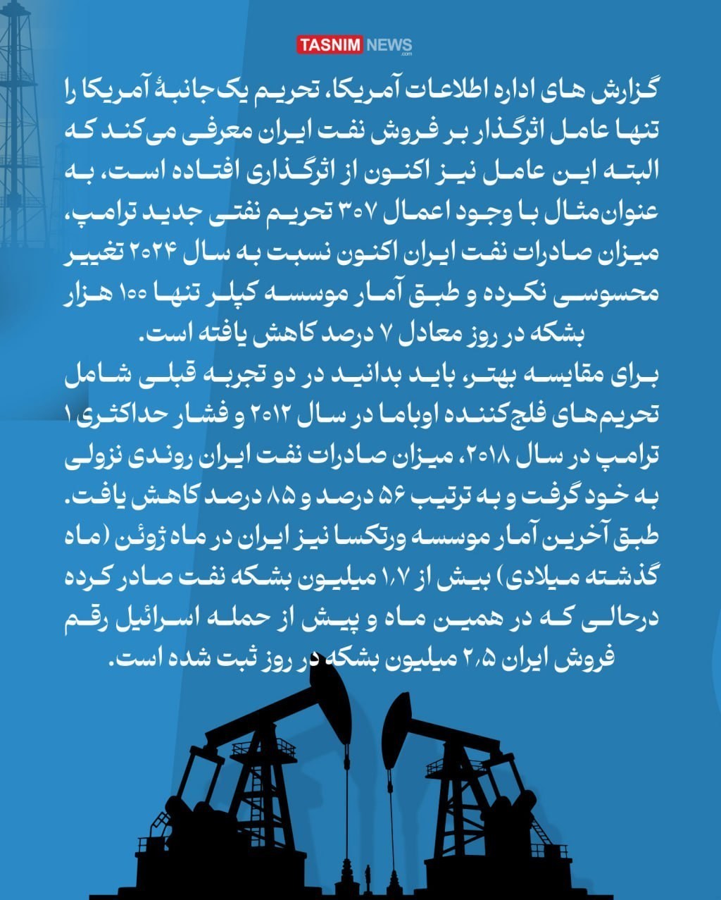 گزارش های اداره اطلاعات آمریکا، تحریم یک‌جانبۀ آمریکا را  تنها عامل اثرگذار بر فروش نفت ایران معرفی می‌کند که البته این عامل نیز اکنون از اثرگذاری افتاده است، به‌عنوان‌مثال با وجود اعمال 307 تحریم نفتی جدید ترامپ، میزان صادرات نفت ایران اکنون نسبت به سال 2024 تغییر محسوسی نکرده و طبق آمار موسسه کپلر تنها 100 هزار بشکه در روز معادل 7 درصد کاهش ‌یافته است. برای مقایسه‌ بهتر، باید بدانید در دو تجربه قبلی شامل تحریم‌های فلج‌کننده اوباما در سال 2012 و فشار حداکثری 1 ترامپ در سال 2018، میزان صادرات نفت ایران روندی نزولی به خود گرفت و به ترتیب 56 درصد و 85 درصد کاهش یافت. طبق آخرین آمار موسسه ورتکسا نیز ایران در ماه ژوئن (ماه گذشته میلادی) بیش از 1.7 میلیون بشکه نفت صادر کرده درحالی که در همین ماه و پیش از حمله اسرائیل رقم فروش ایران 2.5 میلیون بشکه در روز ثبت شده است.