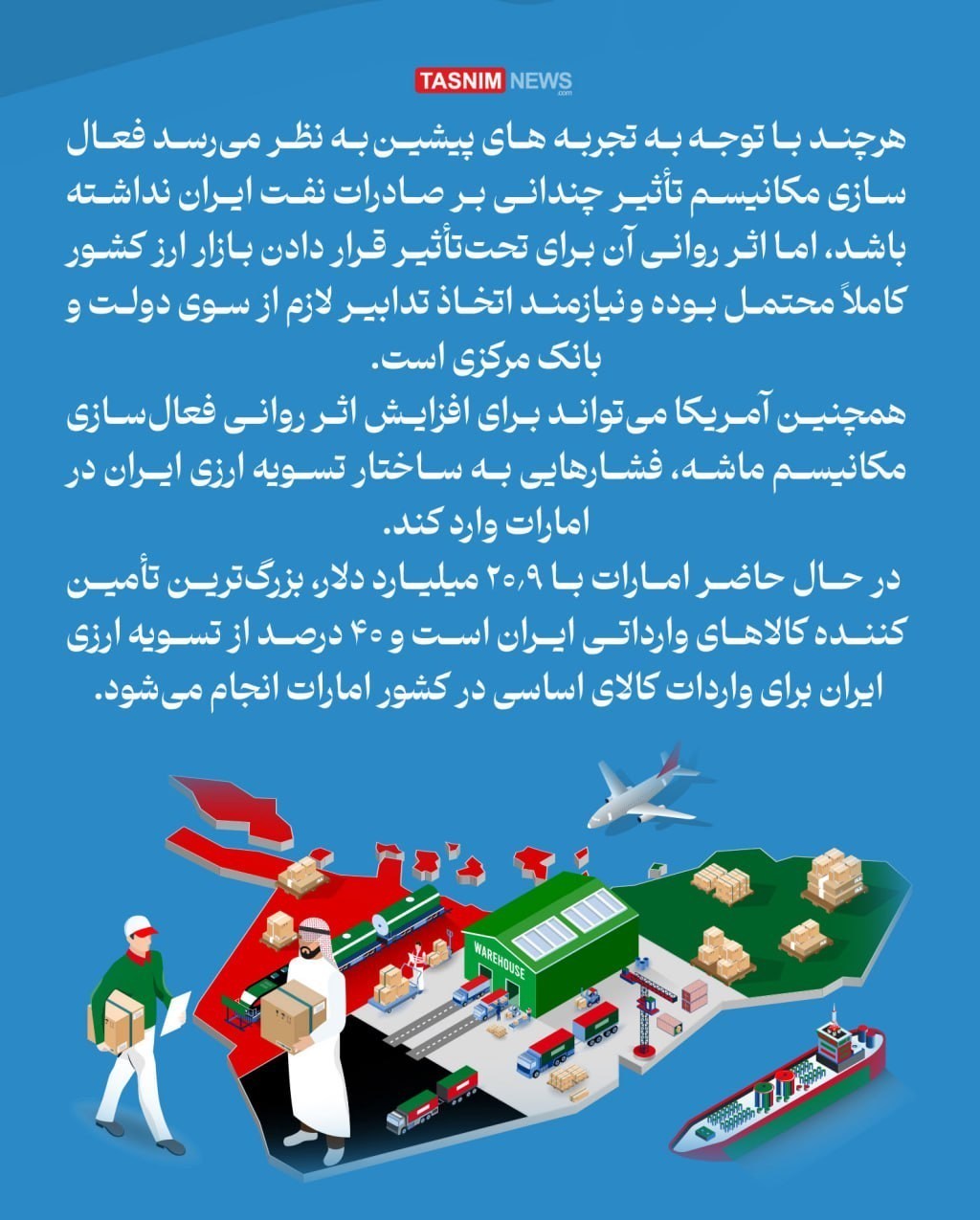 هرچند با توجه  به تجربه های پیشین به نظر می‌رسد فعال‌سازی مکانیسم تأثیر چندانی بر صادرات نفت ایران نداشته باشد، اما اثر روانی آن برای تحت‌تأثیر قرار دادن بازار ارز کشور کاملاً محتمل بوده و نیازمند اتخاذ تدابیر لازم از سوی دولت و بانک مرکزی است. همچنین آمریکا می‌تواند برای افزایش اثر روانی فعال‌سازی مکانیسم ماشه، فشارهایی به ساختار تسویه ارزی ایران در امارات وارد کند. در حال حاضر امارات با 20.9 میلیارد دلار، بزرگ‌ترین تأمین‌کننده کالاهای وارداتی ایران است و 40 درصد از تسویه ارزی ایران برای واردات کالای اساسی در کشور امارات انجام می‌شود.