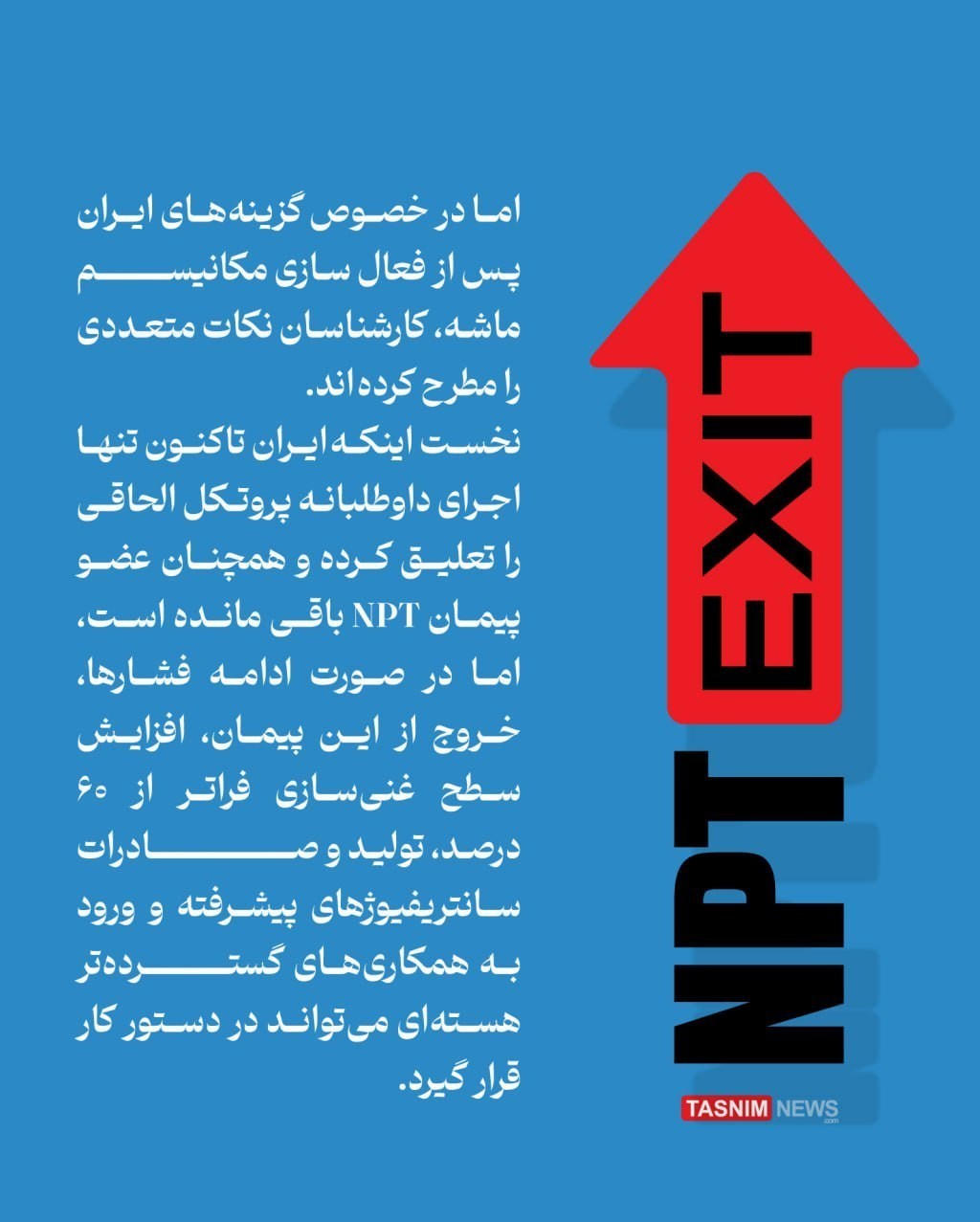 اما در خصوص گزینه‌های ایران پس از فعال سازی مکانیسم ماشه، کارشناسان نکات متعددی را مطرح کرده اند. نخست اینکه ایران تاکنون تنها اجرای داوطلبانه پروتکل الحاقی را تعلیق کرده و همچنان عضو پیمان NPT باقی مانده است، اما در صورت ادامه فشارها، خروج از این پیمان، افزایش سطح غنی‌سازی فراتر از 60 درصد، تولید و صادرات سانتریفیوژهای پیشرفته و ورود به همکاری‌های گسترده‌تر هسته‌ای می‌تواند در دستور کار قرار گیرد.